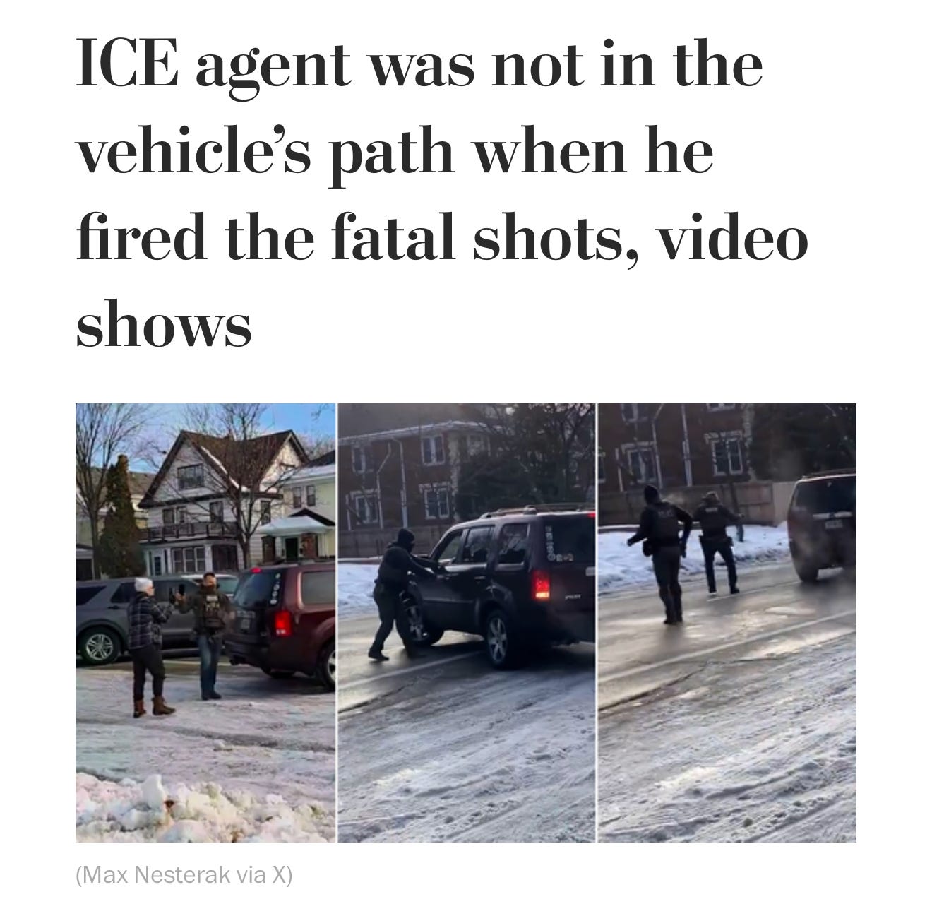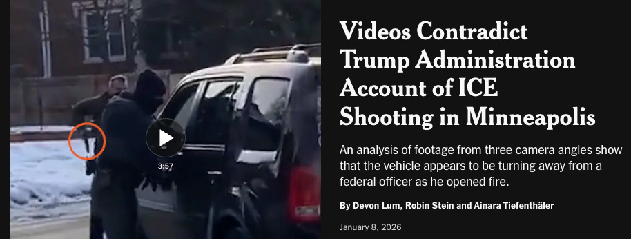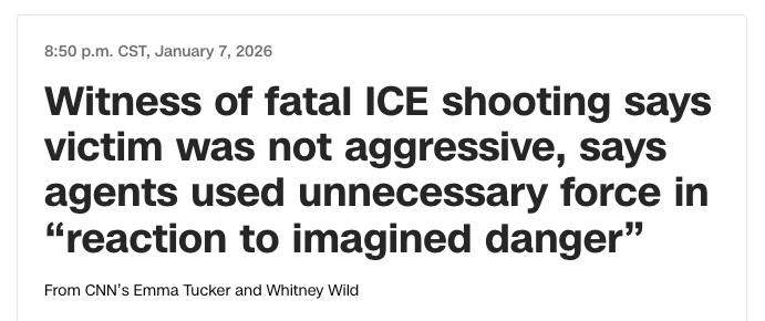 I thought that the national media would do their usual pro-law enforcement slant to their headlines, asserting that Homeland Security says Good was a domestic terrorist who was an imminent threat who tried to run over the ICE agent. And there is definitely some of that here and there. But largely, I am also seeing coverage like this: