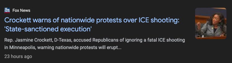 Even FOX News, while largely supporting the administration version of events with headlines and stories ranging from blatantly biased to insanely detached from reality, has a few decent headlines I was able to find, like this one. Someone seeing this on the left would likely say “Hell, yeah — it was a state-sanctioned execution!” while for most of their audience, it is probably meant to show Crockett as an anti-American communist or something (1-8-2026).
