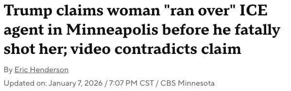 CBS News, which is now led by far-right Trump supporter Bari Weiss, appears to have mostly neutral headlines, but a few headlines specifically challenging the official narrative such as this one (1-7-2026).